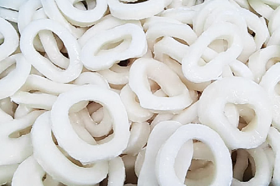 ANILLAS AMARILLAS: Cortadas en doble troquel circular, sin laminar el ventral. Separadas de botones y recortes. Se lava, embandeja. Se congela en túnel a -35°C